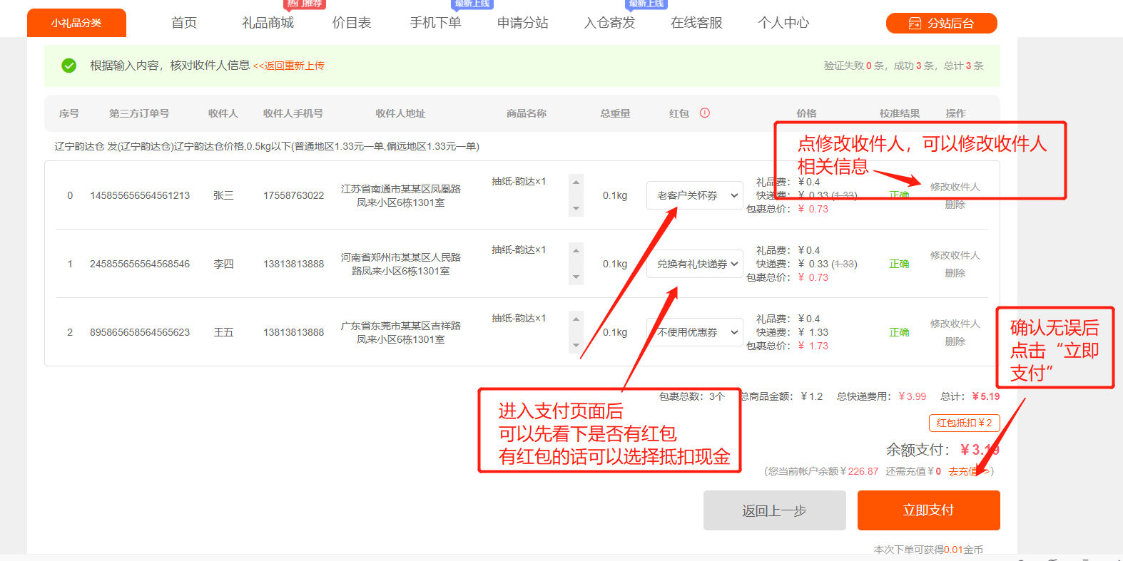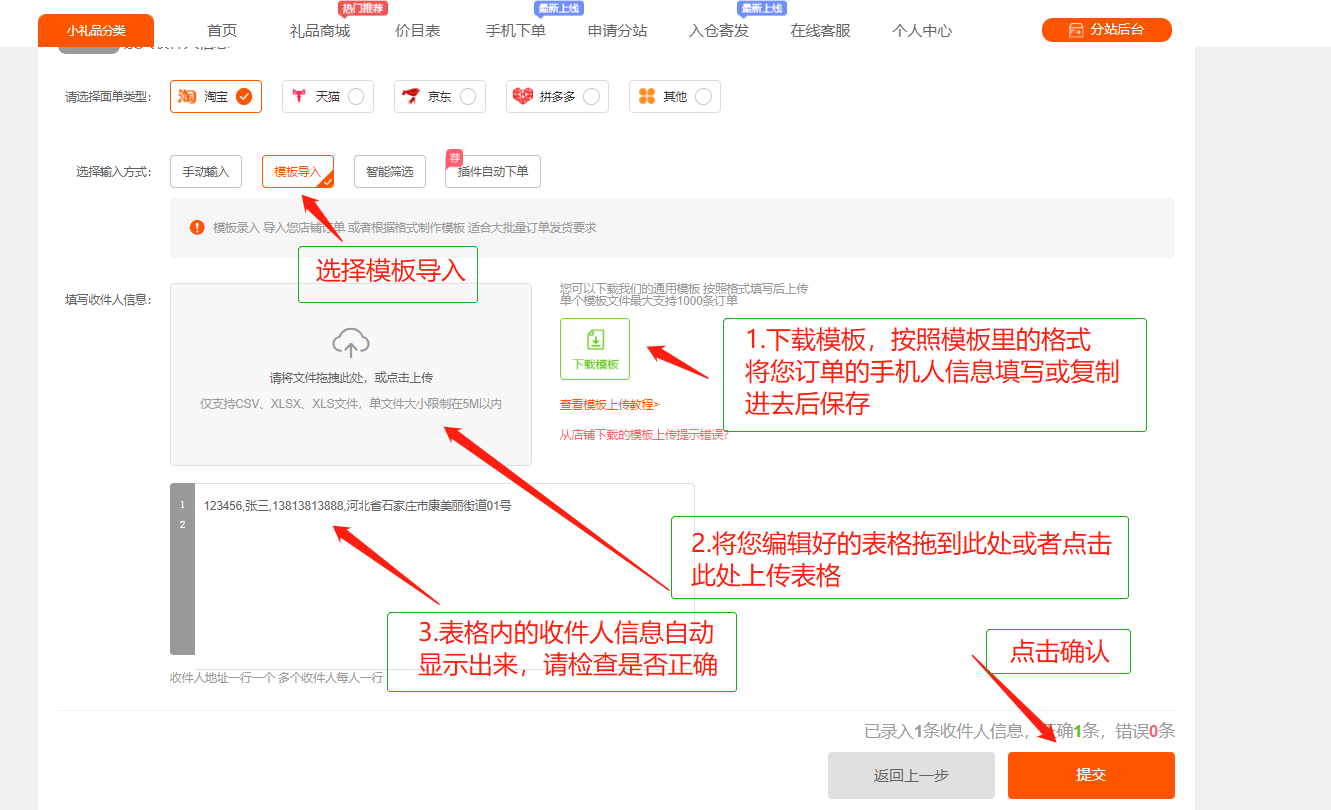 第二步:批量导入表格模板(收件人信息)
