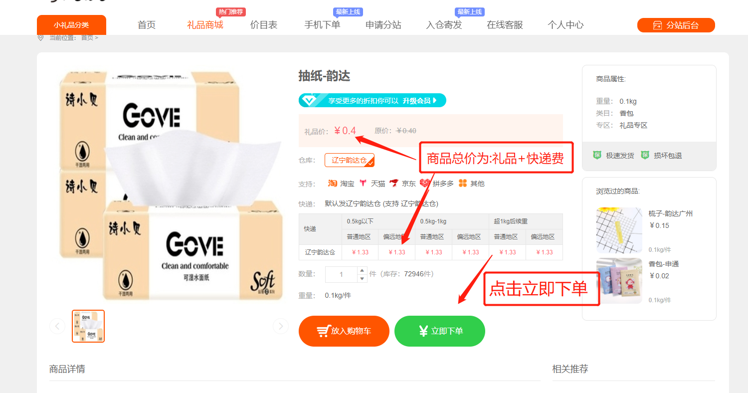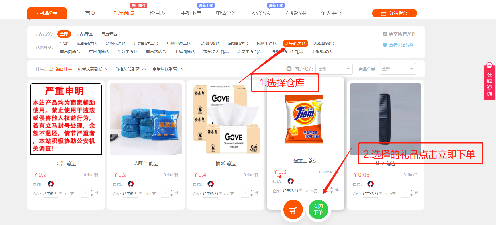 第一步:选择仓库和小礼品